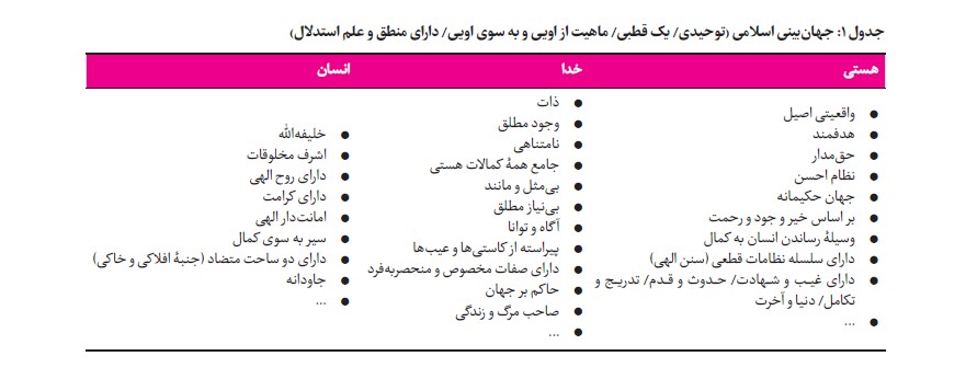 بر اساس این ابزار، جهان‌بینی اسلامی به شناختی از هستی، انسان و خدا رسیده است که در کتب متعدد فیلسوفان اسلامی به آن پرداخته شده است و ما در اینجا به‌جهت اختصار ماحصل آن را در جدول ذیل (با تکیه بر کتاب جهان‌بینی اسلامی (1383) شهید مطهری) ارائه می‌کنیم.