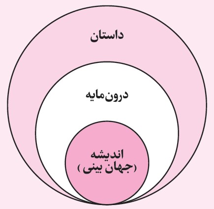 1. درون‌مایه، سطح (لایه) دوم داستان: درون‌مایه و عناصر داستان رابطه‌ای متناظر و دیالکتیک با یکدیگر دارند؛ یعنی عناصر داستان (شخصیت‌پردازی، کنش و واکنش، روابط علت و معلولی و…) می‌تواند محل تجلی درون‌مایه باشد. و نیز درون‌مایه همچون رشته‌ای نامرئی است که عناصر داستان را به یکدیگر پیوند می‌دهد. نکتۀ دیگر آنکه مضمون و درون‌مایه کاملاً ذهنی است و در اندیشۀ نویسنده وجود دارد. (بی‌نیاز، 1388: 53)